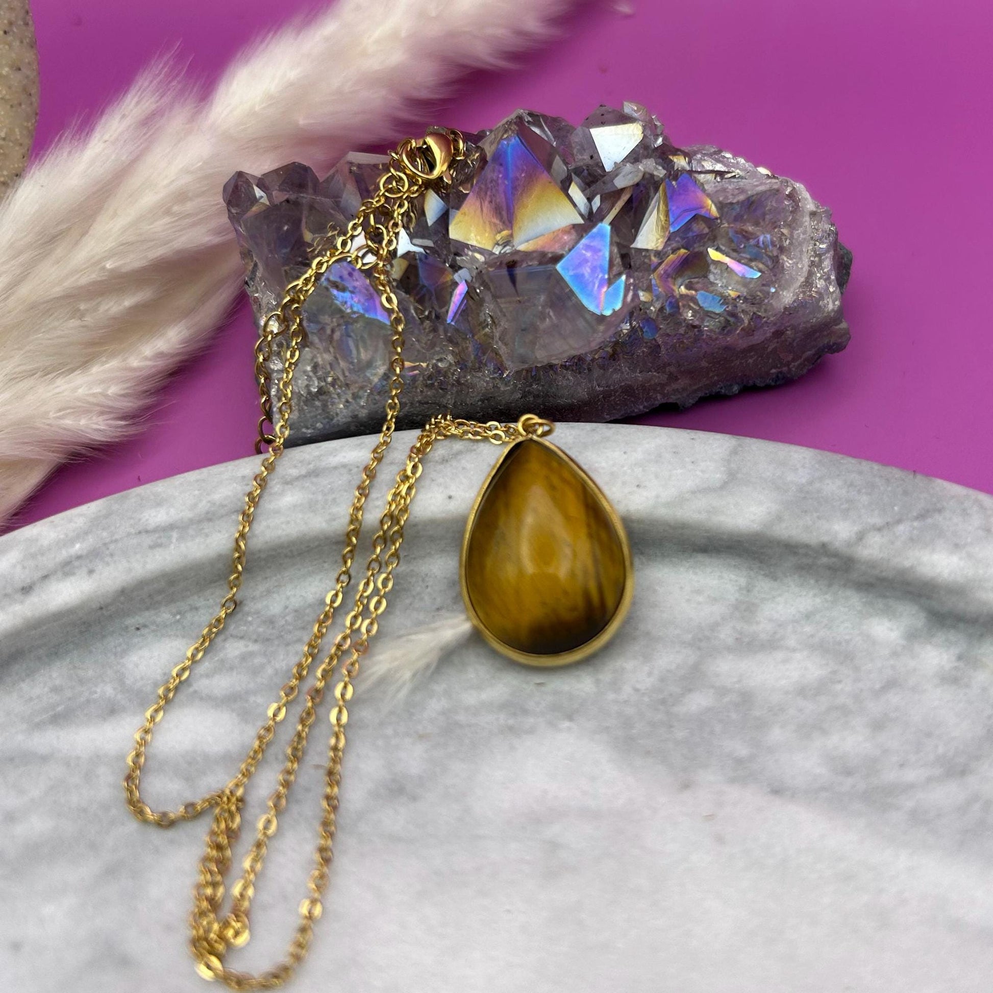 Tiger's Eye Teardrop Necklace: 18k Gold Plated Healing Crystal