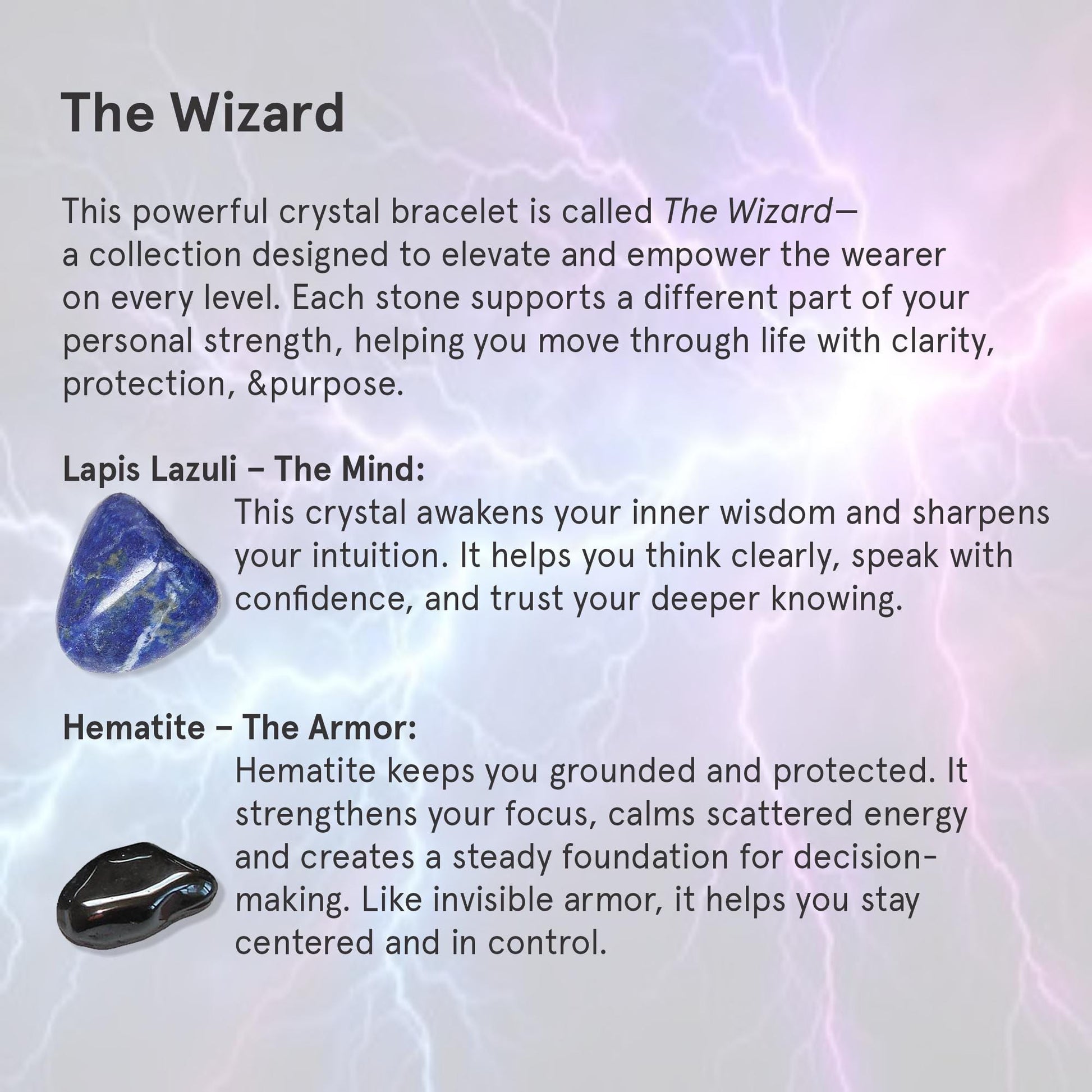 Unlock your inner power with this handcrafted Crystal Wizard Bracelet, featuring genuine Lapis Lazuli, Hematite, Black Agate, and Labradorite for protection, intuition, and grounding. This bold crystal bracelet for men or women blends ancient wisdom and modern style—perfect for spiritual alignment, energy work, or a meaningful gift.