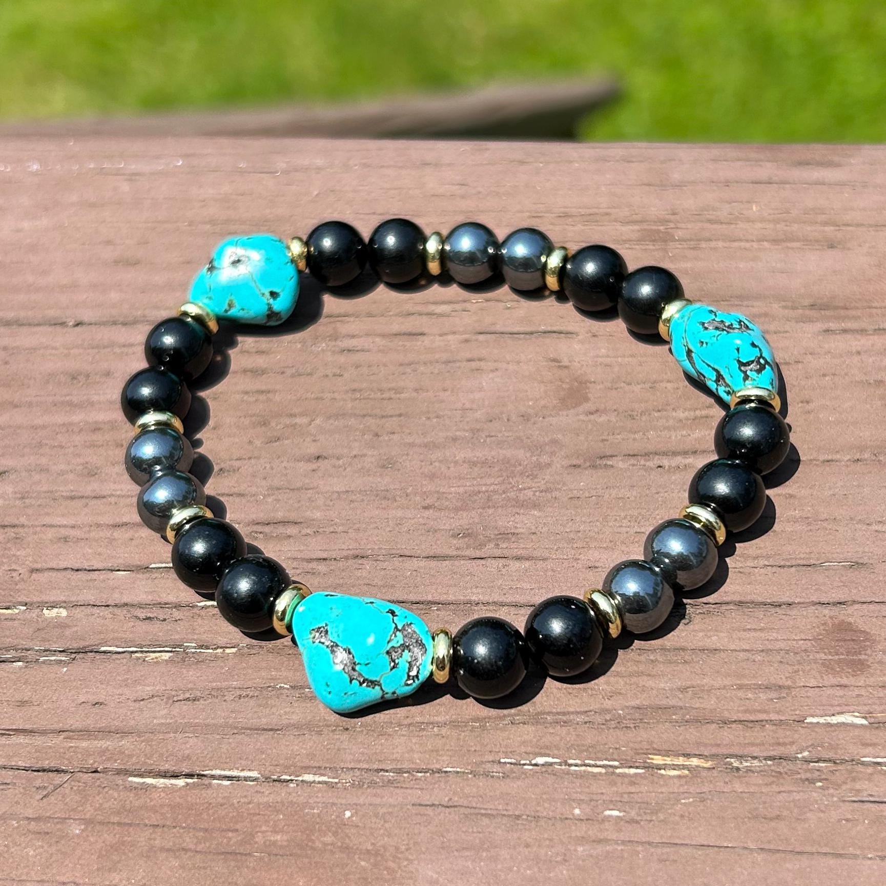 Turquoise, Hematite & Black Agate Bracelet – Unisex Healing Crystal Jewelry for Grounding & Protection
